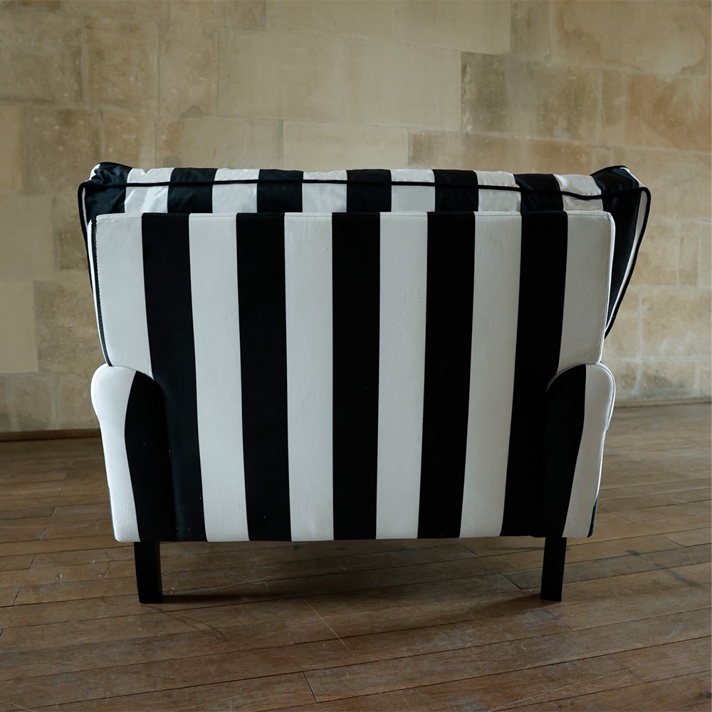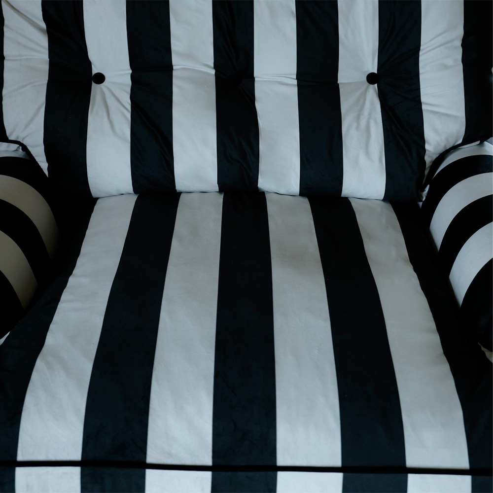 Imprimeul cu dungi verticale alb-negru, intens și contrastant, evocă spiritul modei haute couture, dar și grafica atemporală a interioarelor Art Deco. Este un fotoliu statement, menit să devină piesa centrală a livingului, bibliotecii sau lounge-ului, atrăgând privirea și completând decorurile sofisticate.