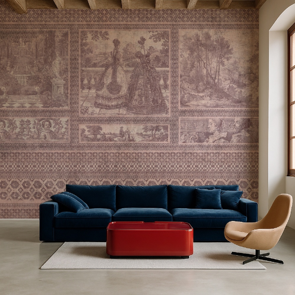 Tapetul Mythic Panorama Rose este o frescă grandioasă a legendelor atemporale. Scene mitologice se desfășoară pe panouri de artă barocă. Această murală surprinde drama poetică a zeilor, eroilor și a alegoriilor. Transformă pereții în teatre ale istoriei și imaginației.