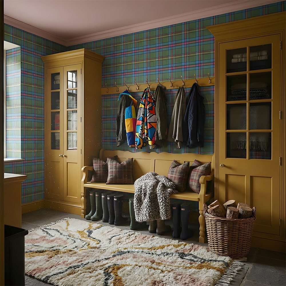 Datorită paletei sale neconvenționale, acest tapet tartan colorat permite combinații de design curajoase și memorabile: