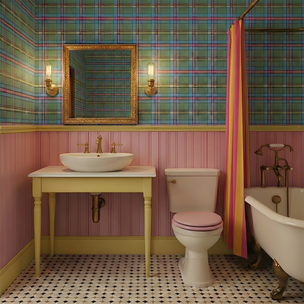 - Baie retro-playful: Așa cum ilustrează imaginile de amenajare, tapetul "Portree" strălucește într-o baie cu personalitate. Se asortează perfect cu lambriuri roz (wainscoting), mobilier galben vanilie și accesorii vintage din alamă, creând un spațiu sanitar care pare desprins dintr-un film de Wes Anderson.