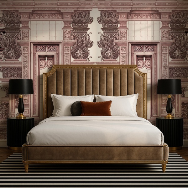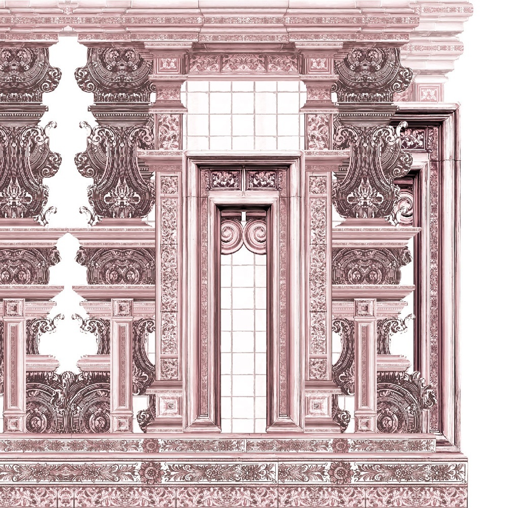 Ornamental Cathedral Rose este apogeul colecției — un mural de arhitectură monumentală, unde coloane, arcade și ornamente baroce se înalță într-o splendoare poetică. Acest tapet transformă măreția sacră în grandiozitate pentru interior.